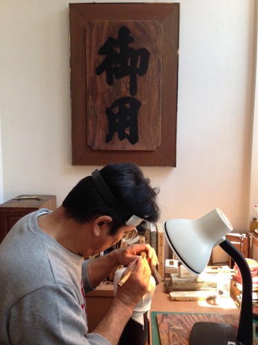 ※写真は、12代目細字左平さん。壁にかかっているのは5代目の左平さんが加賀藩の勘定奉行から賜った「加賀藩御用達」の看板。