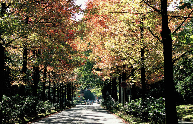 先に「好きだった」と過去形で書いたのは、旧県庁の跡地と旧中央公園(いしかわ四高記念公園)の整備によって、以前はアメリカ楓のトンネルのようだった並木道の景観が失われてしまったからです。そのことが良いとか悪いとかということではなく、ただ個人的にはかつてのトンネル状の、少し薄暗いくらいの並木道が好きでした。ちなみに写真にあるのは、そのかつての姿です(写真提供/金沢市)。秋が訪れるたび、うきうきと歩いた日々を思い出させてくれます。