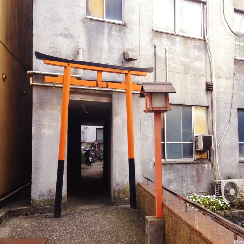 ビルの外からは手水舎も本殿も見えないため、しめ縄(入口)や鳥居(出口)が目印です。