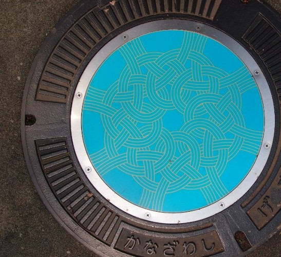 マンホールの蓋は、自治体によって図案が異なります。なかには、けっこうユニークなものもあったりして。 今回の写真は金沢市内の片町~武蔵間(国道157沿いの歩道)で見ることのできる「水引マンホール」です。地元の美大生が加賀水引をモチーフにデザインしたもので、地味だった金沢市のマンホール界に射し込んだ光明とでも呼びたい作品です。ライトブルーとイエローの組合せは美しいものの、肝心の水引のデザインがやや視認しづらいのが玉にキズですが。