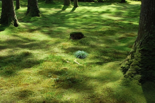 まず、びっくりするのが、その手入れの行き届いた美しさ! 緑の苔がまるで雲母のように広がる庭を歩く心地よさといったら他に例えようがありません。日向の環境を好むウマスギゴケ、半日蔭の環境を好むハイゴケ、日陰の環境を好むヒノキゴケなどなど、専門家の調査では、なんと48種類もの苔類が確認されているのだとか。山間の谷筋に沿ったその土地の風土が生んだ、それらの多様な苔が織り成す造形の一つひとつが、まさしく自然の芸術と呼ぶにふさわしいものでした。
