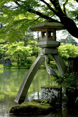 また灯籠の2本の脚だが、一方が長くて池の水に浸かっており、もう一方は短くて陸に固定されている。このアンバランス感が灯籠そのものの美しさを際立たせているようにも思え、デザインの妙にいたく感心したりもするわけであるが、調べてみたら、もともとは両脚とも同じ長さで池に浸かっていたようである。明治初期頃に今の姿になったそうだが、そうなった理由は定かではない。ちなみに現在の徽軫灯籠は二代目。昭和52年の暮れに何者かに壊され、作り直されたものである。