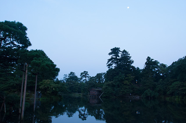写真は園内の「霞が池」がうっすらと明るくなっているところに月が見えているところです。
