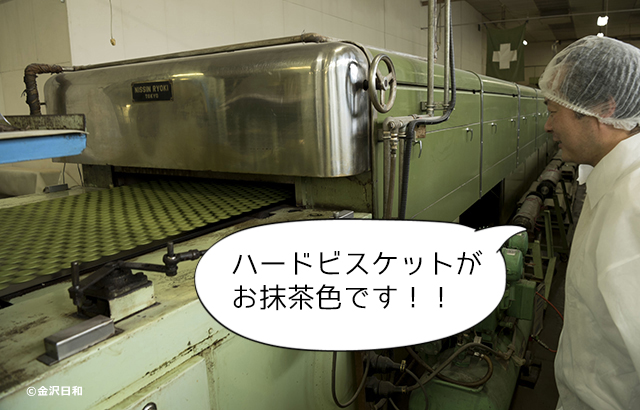 出来た生地は型どりの機械に運ばれ、コンベアで運ばれます。この時点ではお抹茶の色ですね。通常のハードビスケットと同じ工程で作られるそうで、味が混ざらないように毎回徹底的に清掃されるのだとか。