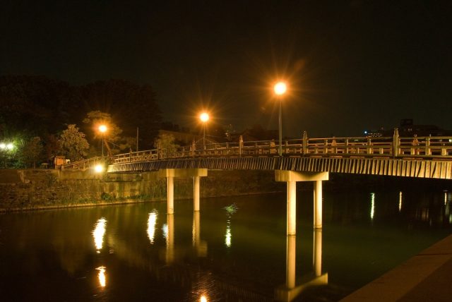 土台はコンクリートながら、上の部分は木になっていて風情たっぷり。車の通らない歩行者専用の橋になっていて、橋を通るひとも疎らで、記念撮影をするにはぴったり。夜にはライトアップもされるので、今流行のインスタ映えも間違いなしです。