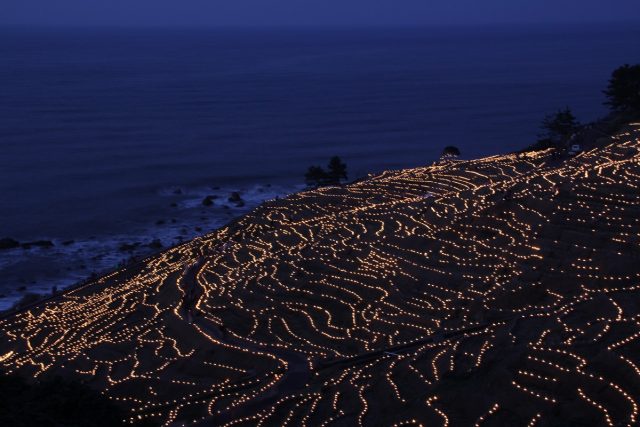 海岸線に沈んでいく夕日の美しさも素晴らしく、千枚田には遊歩道(但し、かなりな急斜面です)も設けられているのでデートにも最適。なお、今年度は3月11日(日)まで実施されるそうで、海風が激しく、夜間はかなり冷え込みますが、防寒対策バッチリで足を運ばれることを強くおすすめします!