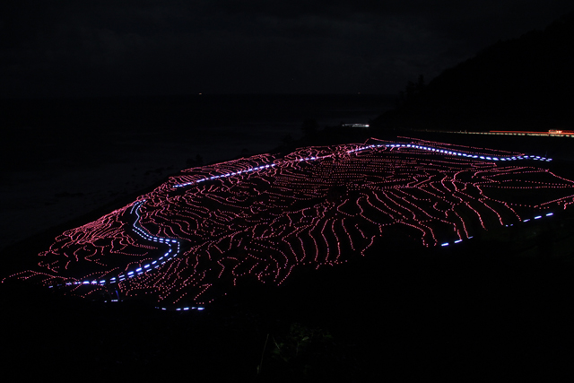 夜の白米千枚田を彩るのは、あぜ道に並べられた25,000個ものソーラーLED。ピンクからグリーン、ゴールド、ブルーへと15分毎にゆっくり変化しながら、日本の原風景を幻想的に演出する。