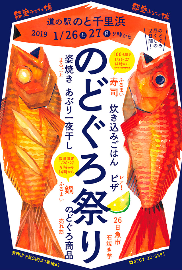 毎年人気の「のどぐろ祭り」が今年も『道の駅のと千里浜』で開催。各回限定100個「のどぐろ寿司」のふるまい、先着順「のどぐろ鍋」のふるまいは行列ができる評判ぶり。『ちりはまホテルゆ華』の「のどぐろ弁当」「まるごと姿焼き」「一夜干し」、イベント限定レストランのとののど手製「のどぐろご飯」、ベーカリー特製「のどぐろピザ」など、のどぐろ尽くしを味わおう。
