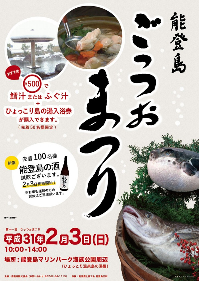 能登島近海でとれた地物・鱈とふぐを満喫できる催し「能登島ごっつおまつり」。鱈汁・ふぐ汁をはじめ、お母さんたちが作った漬物や味噌、草餅、かき餅などの特産品、能登島産の焼き牡蠣など、この季節ならではの能登島のごっつお(ごちそう)が堪能できる。さらに、2020年2月2日(日)に発売開始される『能登島』の試飲(先着100名限定)や、お楽しみ抽選会も実施。盛りだくさんの内容となっている。