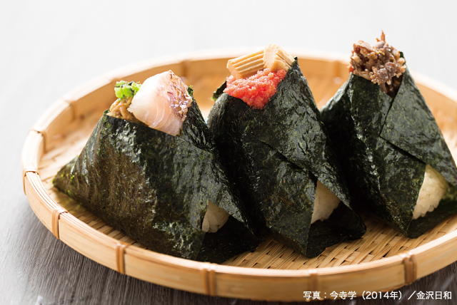 「金沢21世紀美術館」から徒歩3分の場所にあるおにぎり専門店。米は地元産にこだわり、よりおにぎりに適した二俣地区の有機米を使用。梅干しやこんぶといった定番はもちろん、加賀れんこんや能登牛、いか黒づくりといった地元色が香る味覚も人気が高い。具は月替わりの品も含め、40種類以上が揃う。