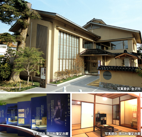 自然主義文学の大家として、明治・大正・昭和と三代にわたり第一線で活躍。「金沢の三文豪」のひとりである徳田秋聲を紹介する記念館。黒瓦屋根の採用、格子を取り入れた外観など、金沢の街並みに似合うように作られている。館内には、展示室をはじめ、再現書斎や和紙人形シアターなどがある。