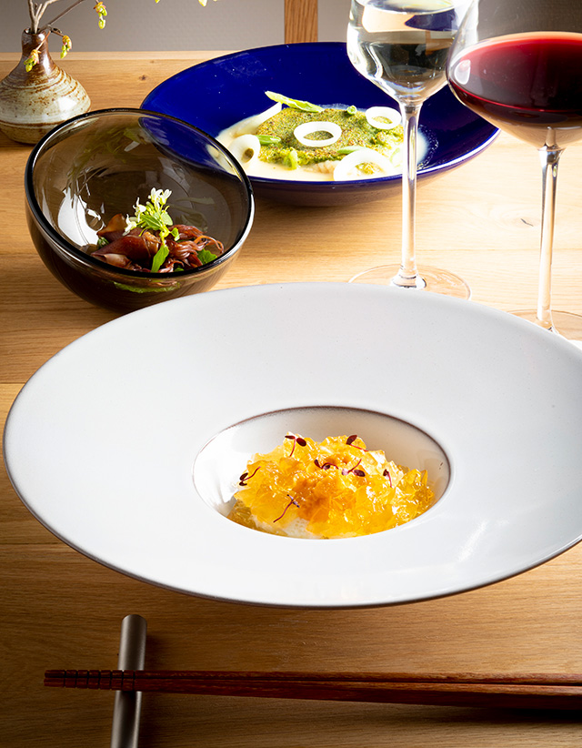 スタイリッシュな中に金沢らしさを演出した空間で、北陸の食材を活かした創作料理を提供する注目店。和洋の垣根を越えて独創性に富んだメニューは、ワインや日本酒など自由に合わせて、お箸で気軽に楽しめる。和洋、新古が入り混じる個性豊かな一軒だ。