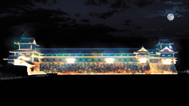 金沢城のシンボルである菱櫓(ひしやぐら)・五十間長屋・橋爪門続櫓(つづきやぐら)に投影され、その横幅はなんと約140mという大きさ。さらに瓦や石垣の一つひとつまで計算し、その造形を生かした繊細な映像が投影される予定とあっては、どんな映像が投影されるのか想像するだけでも、わくわくしてしまいますね。
