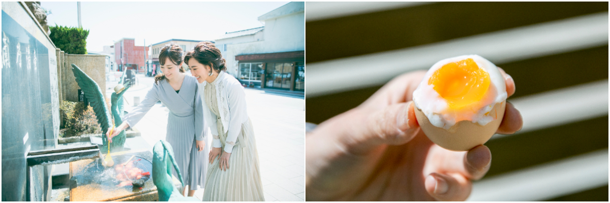 「湯元の広場」に設置されたカゴにたまごを入れ、源泉に浸して待つこと13~16分。ほんのり塩味に仕上がる。