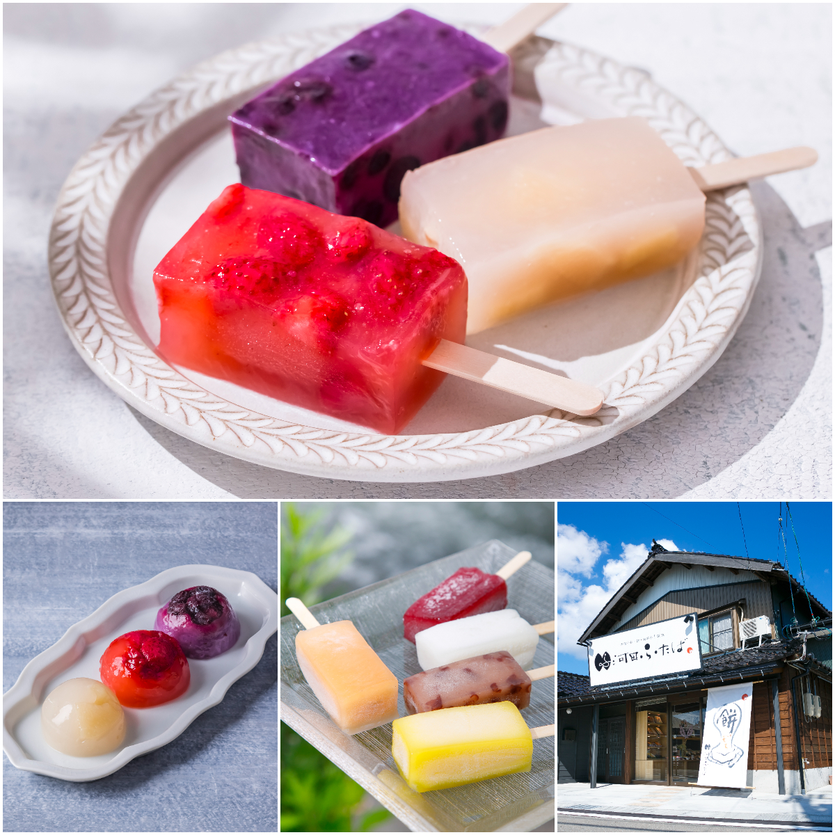 夏の暑さを吹き飛ばすような冷たさと美味しさで人気の『河田ふたば』の「葛アイスバー」。今年は4代目が考案した「プレミアム葛アイスバー」が新登場して早くも評判を呼んでいる。『農菓プロジェクト』の農家メンバーが生産する果実を葛アイスバーに閉じ込めた、果肉たっぷりのプレミアムバージョン。奥能登の『ひらみゆき農園』より能登ブルーベリー、金沢市の『東果樹』より白桃、小松市の『本田農園』よりイチゴの3種類で、どれも果実の美味しさを引き立たせるよう菓子職人の技が際立っている。