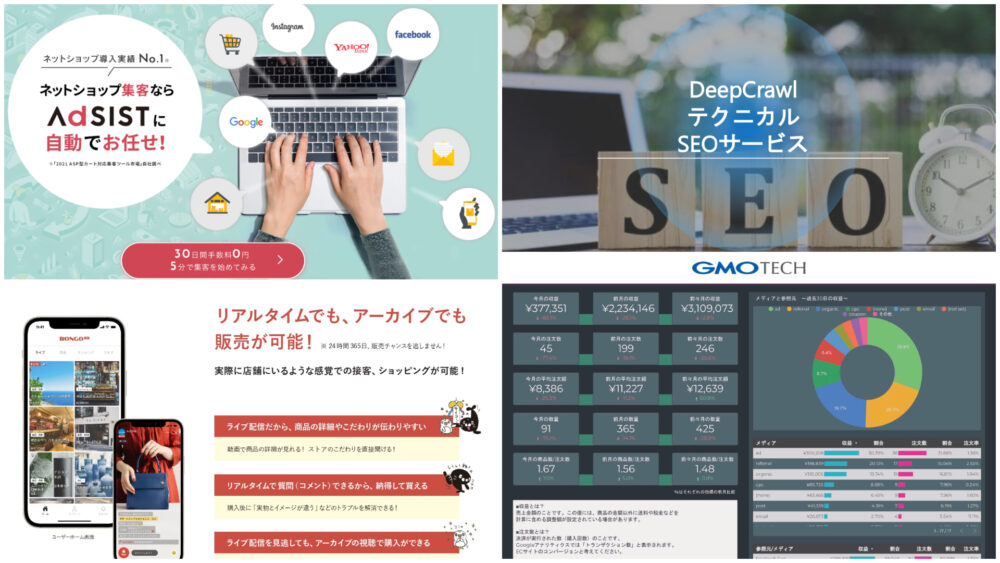 まずは新販売形態「RONGO LIVE(ロンゴ ライブ)」。ライブ配信とEC(電子商取引)を掛け合わせた新たな販売形態「ライブコマース」で、視聴者のコメントや質問にもリアルタイムで答えることができる、インターネット版のTVショッピングです。配信を見逃してもアプリからいつでも動画を見られるのも好評なのだそう。次は、ネットショップの集客に悩む人におすすめのツール「AdSIST(アドシスト)」。WEBコンサルティングとして2,000社以上の支援実績から導き出した知見やデータをもとに、同社のAIがネット広告の運用を自動的に最適化してくれます。登録が5分で済む手軽さと、お得な料金設定が受けているよう。そして、自社のECサイトのアクセス解析とレポートを行う「EC解析」。収益や売上個数、客層、どのサイトから流入してきたかなど、ECサイトを運営する上で欠かせない情報を解析し、1カ月に1回レポートとして提出するシステムです。データをまとめる時間をもっと分析・改善策構築に充てたいという担当者におすすめですよ。最後に、WEBマーケティング施策の代表格『GMO TECH(ジーエムオー テック)』。検索エンジン最適化の略語「SEO (Search Engine Optimization)」の様々な対策を行い、自社サイトの安定的な上位表示を実現させてくれるそう。
