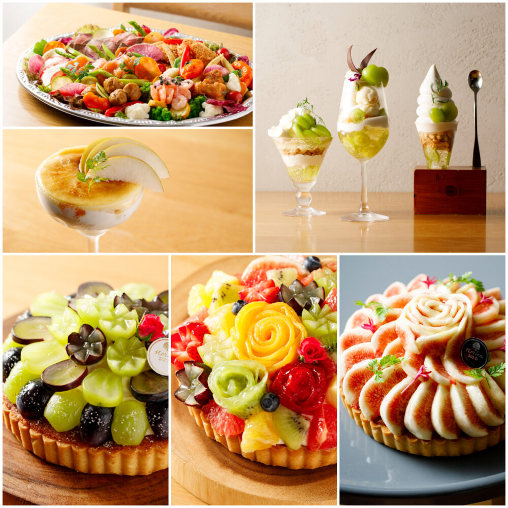 秋めくこの時期は、ブドウやイチジク、黄金桃、梨など旬の果物を贅沢に使用したタルトやパフェが充実。特にシャインマスカットとナガノパープルという2種類のブドウのタルトや、花束のように華やかな見た目の「フルーツスペシャルタルト」など、プレゼントやお祝い事のデザートとしてもおすすめだ。また、果汁がしたたるほどにみずみずしくジューシーで酸味が少ない、石川県のブランド梨「加賀しずく」を使ったパフェにも注目。季節の野菜がたっぷり入ったオードブルの盛り合わせ(要予約)も人気なので、華やかな秋スイーツと組み合わせて、おうちパーティーをさらに盛り上げよう。