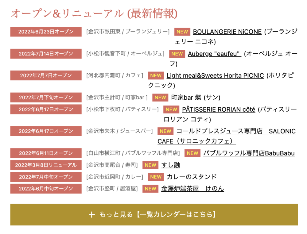 石川県の新店情報を掲載している「NEW OPEN」。 このページでは、石川県内の新店ならびにリニューアルオープンの店を紹介しており、店名と場所、業態、ある場合には公式サイトかSNSへのリンクが掲載しています。