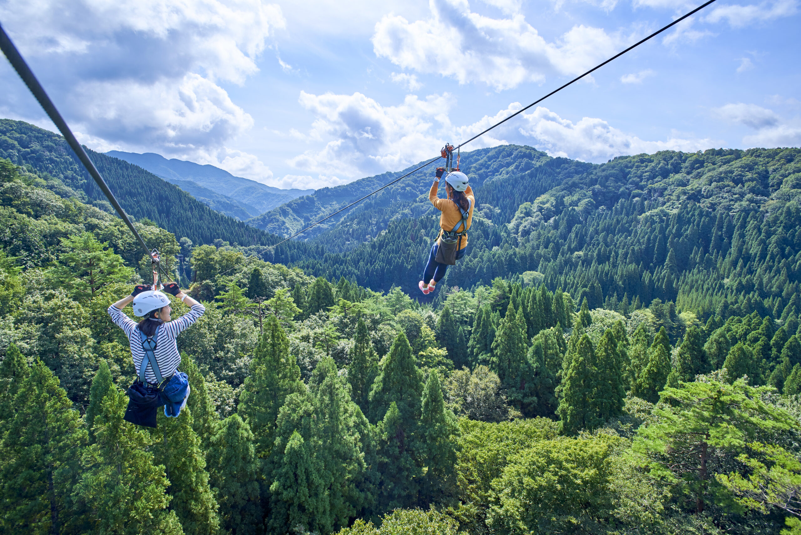 森の上を鳥のように飛んだ気分になれる「メガジップライン」や、樹上に広がる森のジャングルジム「アドベンチャーパーク」など、森や川を利用したアトラクションがいろいろあり、自然とふれあいながら大人も子供も夢中になって遊べます。