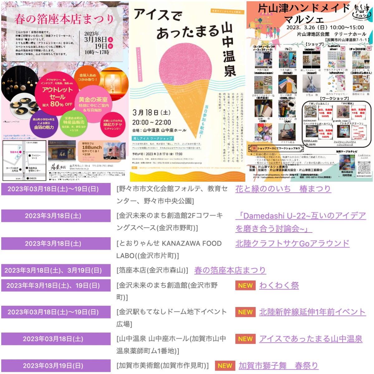 3月は楽しいイベントが盛りだくさん。本日18日(土)開催の「花と緑ののいち椿まつり2023」では、椿の展示や特産物市が楽しめます。『加賀市美術館』では「加賀市獅子舞 春祭り」が開催され、獅子舞の講演会や演舞、獅子頭の展示などがありますよ。18日(土)、19日(日)は金沢駅もてなしドーム地下イベント広場で「北陸新幹線延伸1年前イベント」が開催されます!Kotoha(和楽器、ハープ)、ジャズ21、北陸アイドル部のステージイベントや鉄道グッズ、駅弁の販売、クイズラリーなど充実の内容です。家族や友達みんなで楽しめそうですね。他にも各地で魅力的なイベントが目白押しです。週末やお休みに「どこ行こうかな」と迷ったら、ぜひ「New Event」をチェックしてくださいね。