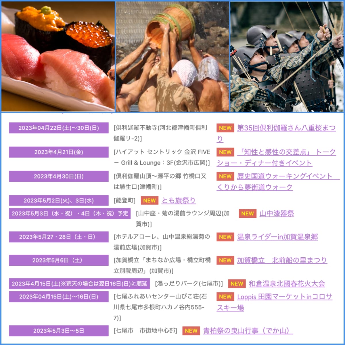 なお、4月中旬から5月末までに石川県内にて開催される祭りやイベント、キャンペーンなども、文字情報にてどんどん追加更新されています。家族や友達みんなで楽しめそうなイベントが目白押しですので、週末やお休みに「どこ行こうかな」と迷ったら、ぜひ「New Event」をチェックしてくださいね。
