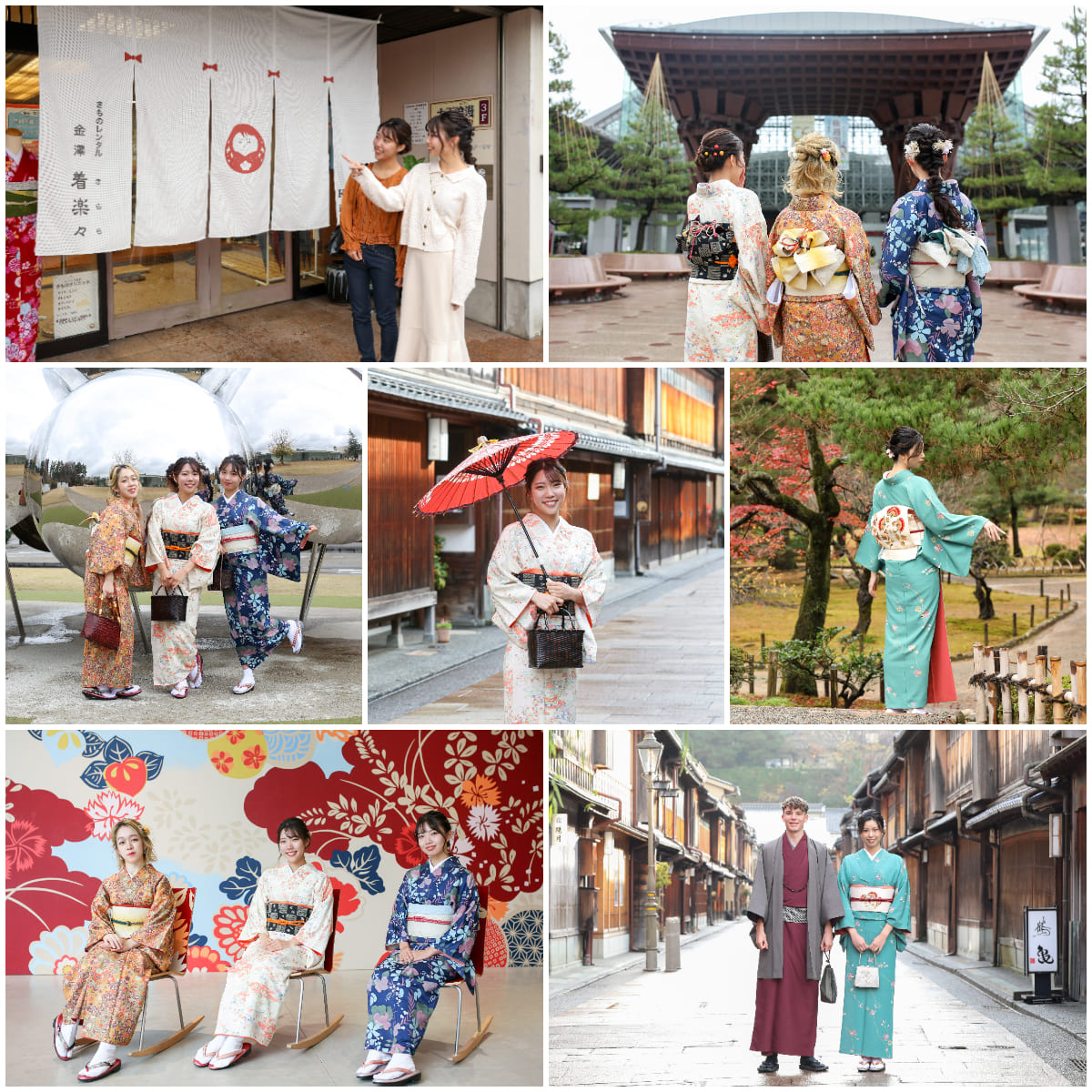そこでおすすめなのが現地で気軽に着付けを行ってくれるレンタル着物。中でも『金澤 着楽々(きらら)』は駅前、ひがし茶屋街、尾山神社といった金沢の主要な観光地の近くに3店舗を構えるため、利用しやすいと評判だ。