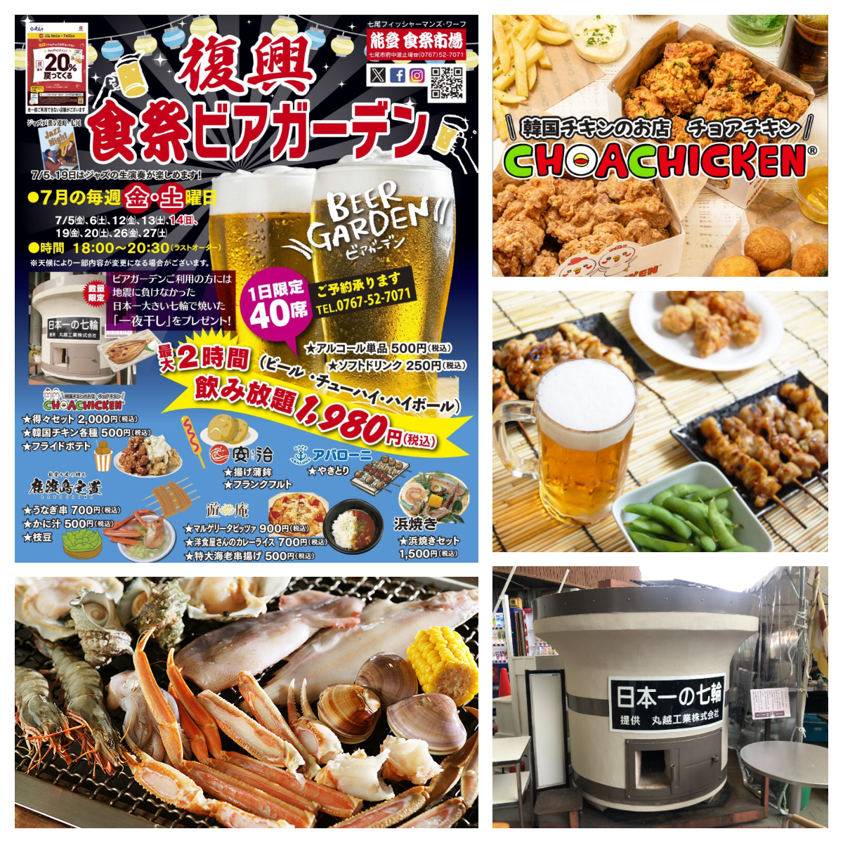 そんな同館で能登の幸が味わえる夏にぴったりのイベント「復興食祭ビアガーデン」が開催中です。 7月の毎週金・土曜限定のビアガーデンでは、ビールやチューハイ、ハイボールなどが1,980円で最大2時間飲み放題。