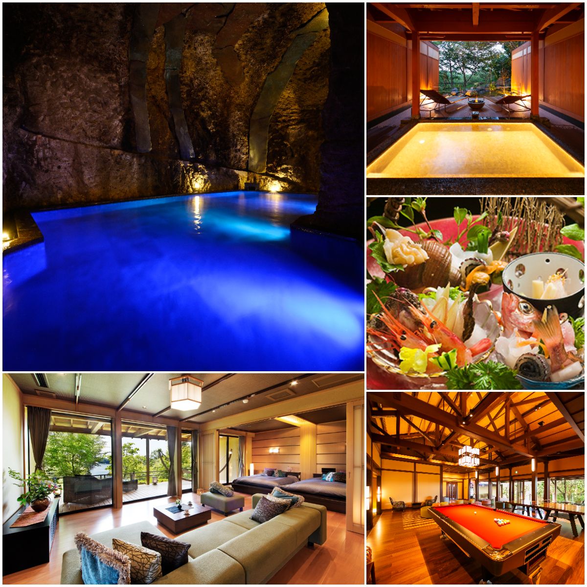 九十九湾に迫り出した風情あふれる食事処やプライベート空間の個室など、個性豊かな空間で料理人が腕を振るった絶品料理を楽しむことができます。くつろぎの時間が約束された広々とした部屋は、贅を尽くした9つのスイートをはじめ、どの部屋からも九十九湾の穏やかなオーシャンビューが楽しめます。