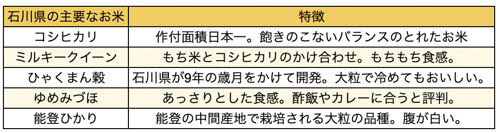 現在、国に品種登録されているお米は約1,000品種あり、そのうちうるち米として作られているのは320種ほど。うるち米とは、コシヒカリやミルキークイーンなど、主食用にごはんとして食べる品種です。石川県で主流の品種をまとめてみました。