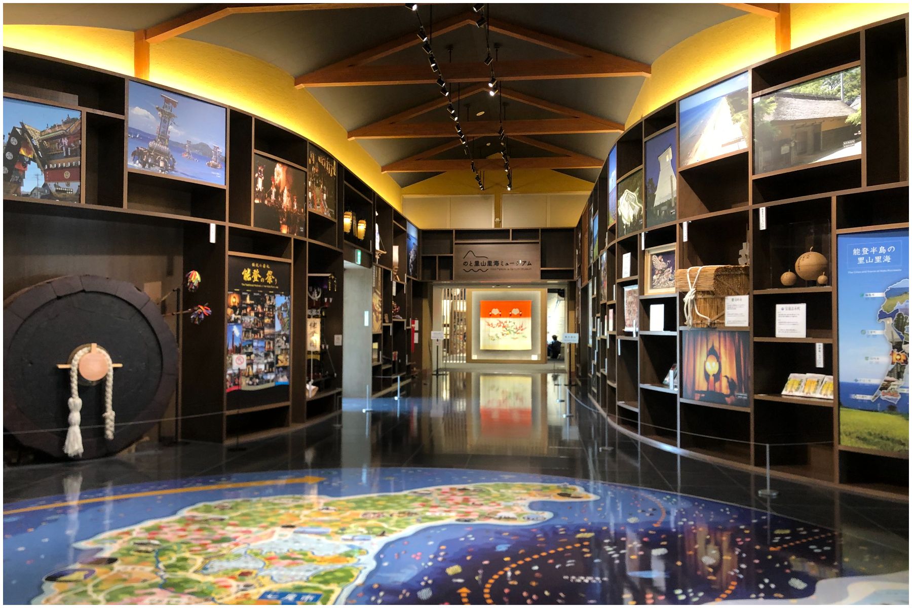 建物内に入ると思わず写真を撮りたくなる美しいエントランスがお出迎え。能登半島の見どころが一目でわかる絵地図「のと空中散歩」が描かれています。展示室では七尾湾(内海)と富山湾(外海)の異なる海の特徴を紹介するコーナーや、能登国の政治・経済・物流の拠点として古くから栄えた七尾の歴史自然と共に生きてきた昔の人々の暮らしを知ることができ、能登の旅がより一層、楽しくなるような内容ばかりでした!
