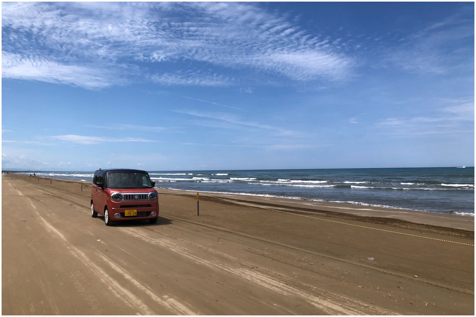 「千里浜なぎさドライブウェイ」はのと里山海道「千里浜IC」降りてすぐ。広がる日本海を眺めながら気持ちよくドライブしました!午後になると海水浴に来る人たちで賑わうこの海岸は日本で唯一の軽自動車や大型バスも走行できる砂浜。毎年開催されるバイクイベントには全国からたくさんの人が訪れます。少しだけ車を下りて海風を感じながら砂浜をお散歩してみるのもおすすめです。