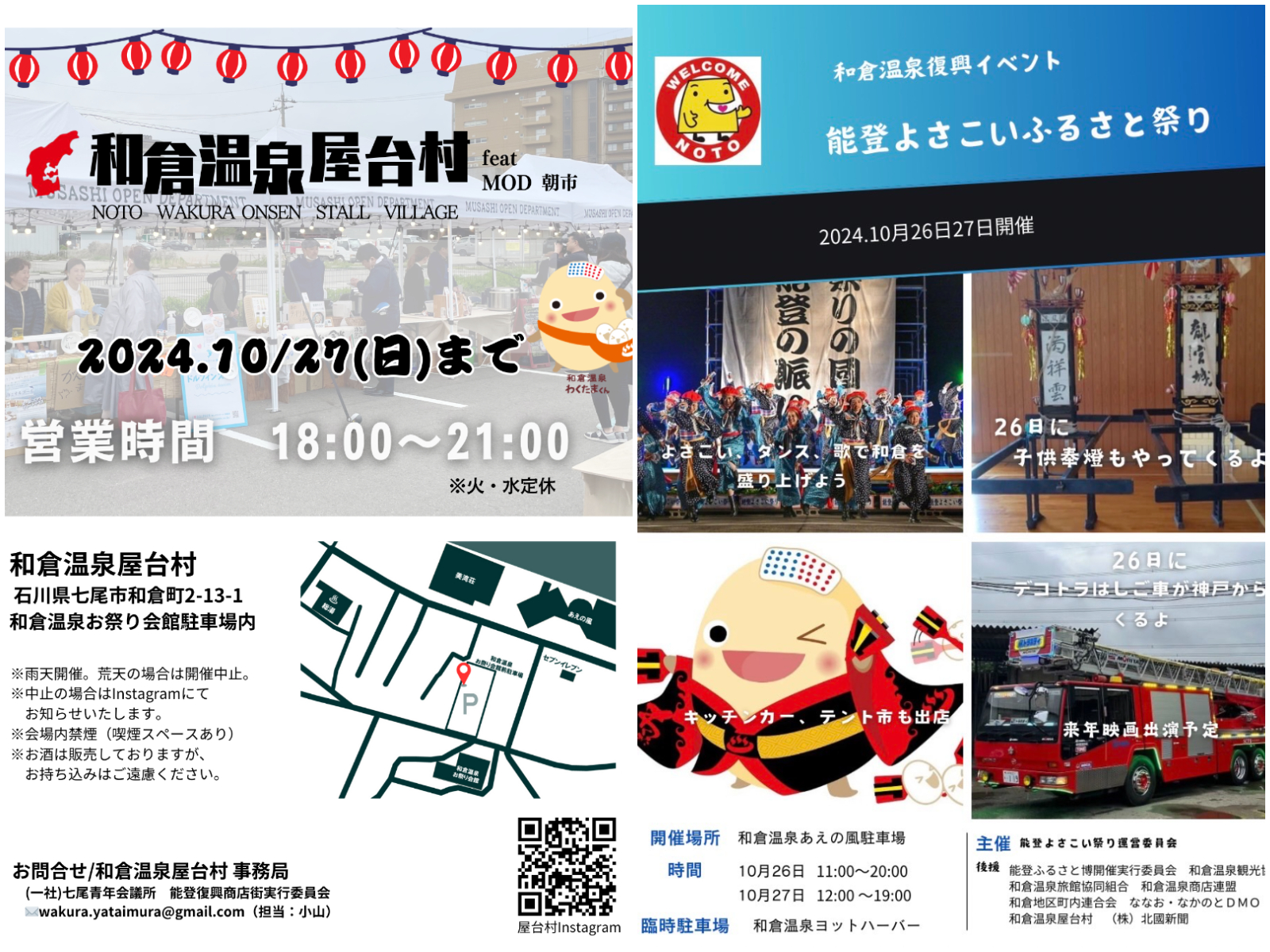 また、毎年6月に“能登は一つ「風土(つち)の唄で踊れよさこいただ狂え」”をテーマに開催されてきた「能登よさこい祭り」も第28回となる今年は開催を中止。そこで、屋台村のフィナーレと、和倉温泉の復興を祈願して「能登よさこいふるさと祭り」を10月26日(土)、27日(日)に開催することになりました。