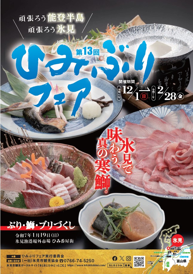 能登のお隣、富山県氷見市にて第13回目を迎える「ひみぶりフェア」を2025年2月28日(金)まで開催中。このイベントには氷見市内の25の飲食店と宿泊施設が参加。富山湾の名物「ひみ寒ぶり」が存分に楽しめます。