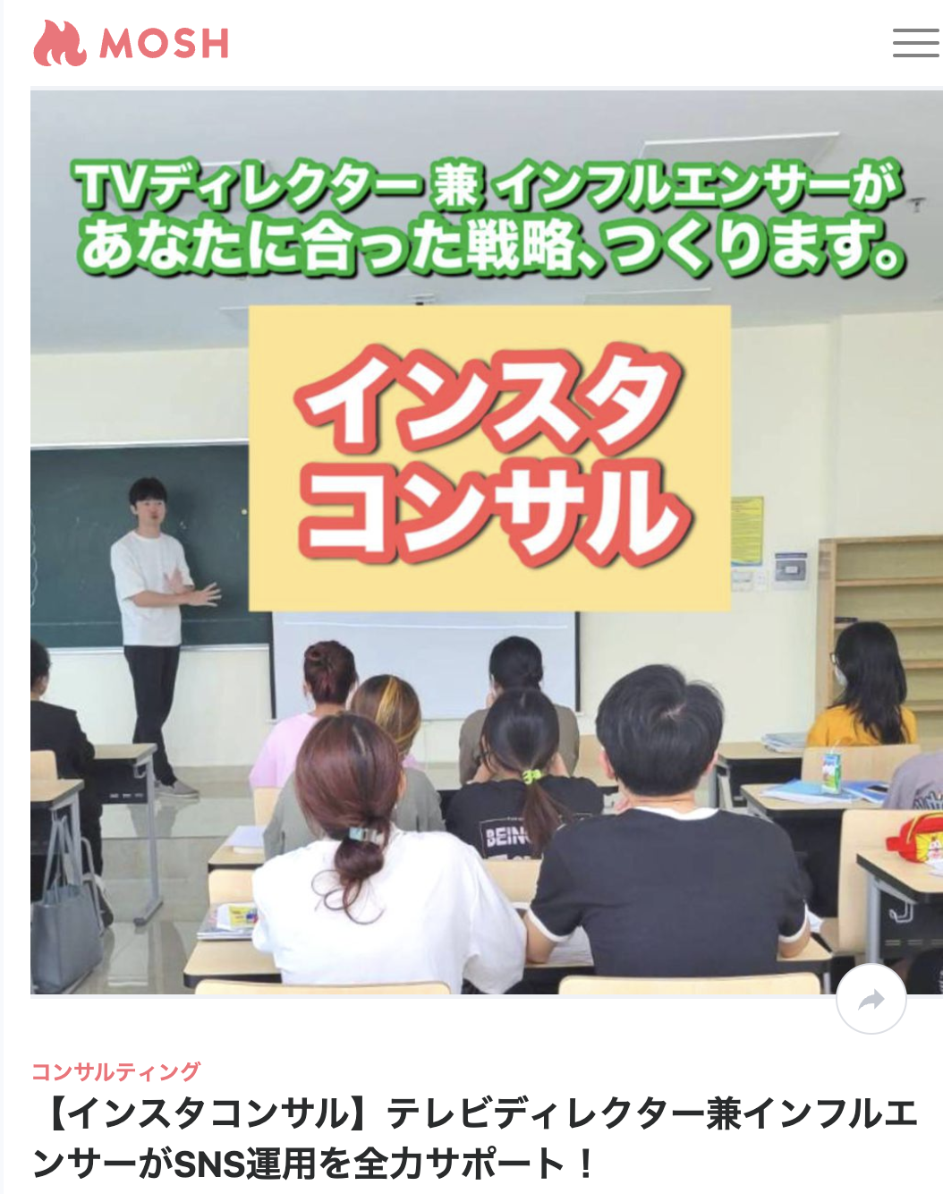感度の高い人たちの注目が集まる中、石川県金沢市に住む『たけそーん』こと山本岳人さんがさっそくMOSHページを開設。「ディレクター歴10年以上の現役テレビ局員」であり、「フォロワー累計55万人のインフルエンサー」の山本さんは、「インスタで集客したいけどうまくいかない!!」「SNS運用を勉強したけどよくわからない…」という声が寄せられるのを受けて、「自分のスキルが役に立つならと思ってはじめてみました」と話す。