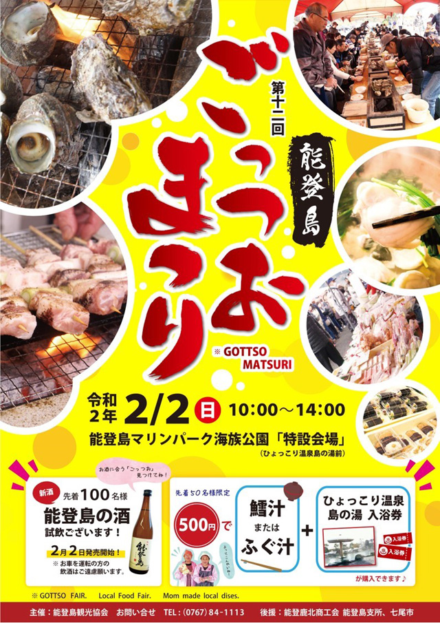 能登島近海でとれた地物・鱈とふぐを満喫できる催し「能登島ごっつおまつり」。鱈汁・ふぐ汁をはじめ、お母さんたちが作った漬物や味噌、草餅、かき餅などの特産品、能登島産の焼き牡蠣など、この季節ならではの能登島のごっつお(ごちそう)が堪能できる。さらに、2020年2月2日(日)に発売開始される『能登島』の試飲(先着100名限定)や、お楽しみ抽選会も実施。盛りだくさんの内容となっている。