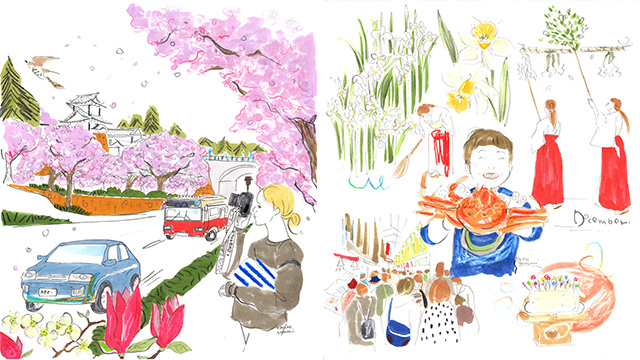 ファッション誌等で活躍する金沢出身のイラストレーター桜井やすこ氏。彼女が描く金沢の歳時記のイラスト展を開催。季節の行事や花々、食材又は料理など、金沢での暮らしに息づく四季折々の風景を柔らかいタッチで表現する。オリジナル作品の販売も行う。会場は金沢市西都にある、インテリア&ギャラリー「林檎舎アップルカンパニー」にて。