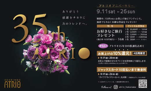 35周年を記念して、旅行券や「アトリオお買物券」が抽選で当たるアニバーサリーフェアを開催!