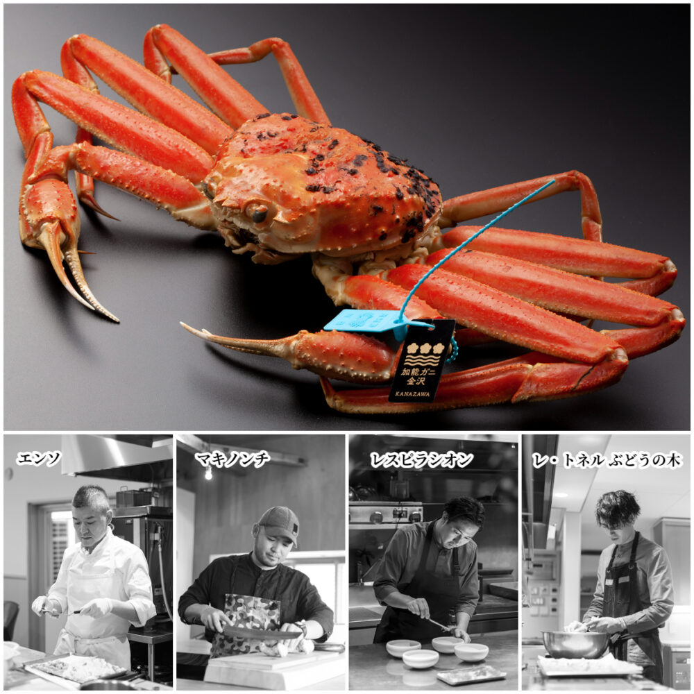金沢市と金沢市水産物ブランド化推進協議会は、金沢港で水揚げされた本ズワイガニの中で、甲羅の幅が11㎝以上で出荷時に脚折れのないオスを「加能ガニ金沢」と命名。加能ガニを示す青タグに加えて、漆に金箔をイメージした、通称「金星」のタグを付けて出荷している。大ぶりの甲羅にはたっぷりと蟹味噌が詰まり、肉厚な脚の身は茹でても焼いても絶品だ。そんな加能ガニ金沢を使って、今月15日(土)から金沢市内の2つ星レストラン4店とコラボしたスペシャルフェア「加能ガニ金沢×2つ星レストラン」を開催。名うてのレストランシェフが、金沢の冬の味覚の王者を存分に楽しめるオリジナルコースを提供する。