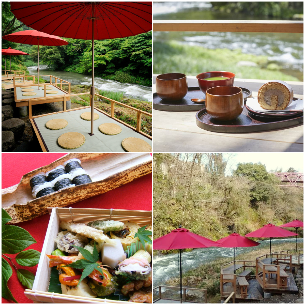 右上/席料+300円で甘味とお茶を楽しめる。左下/川床弁当は前日予約までに各店に予約しよう。
