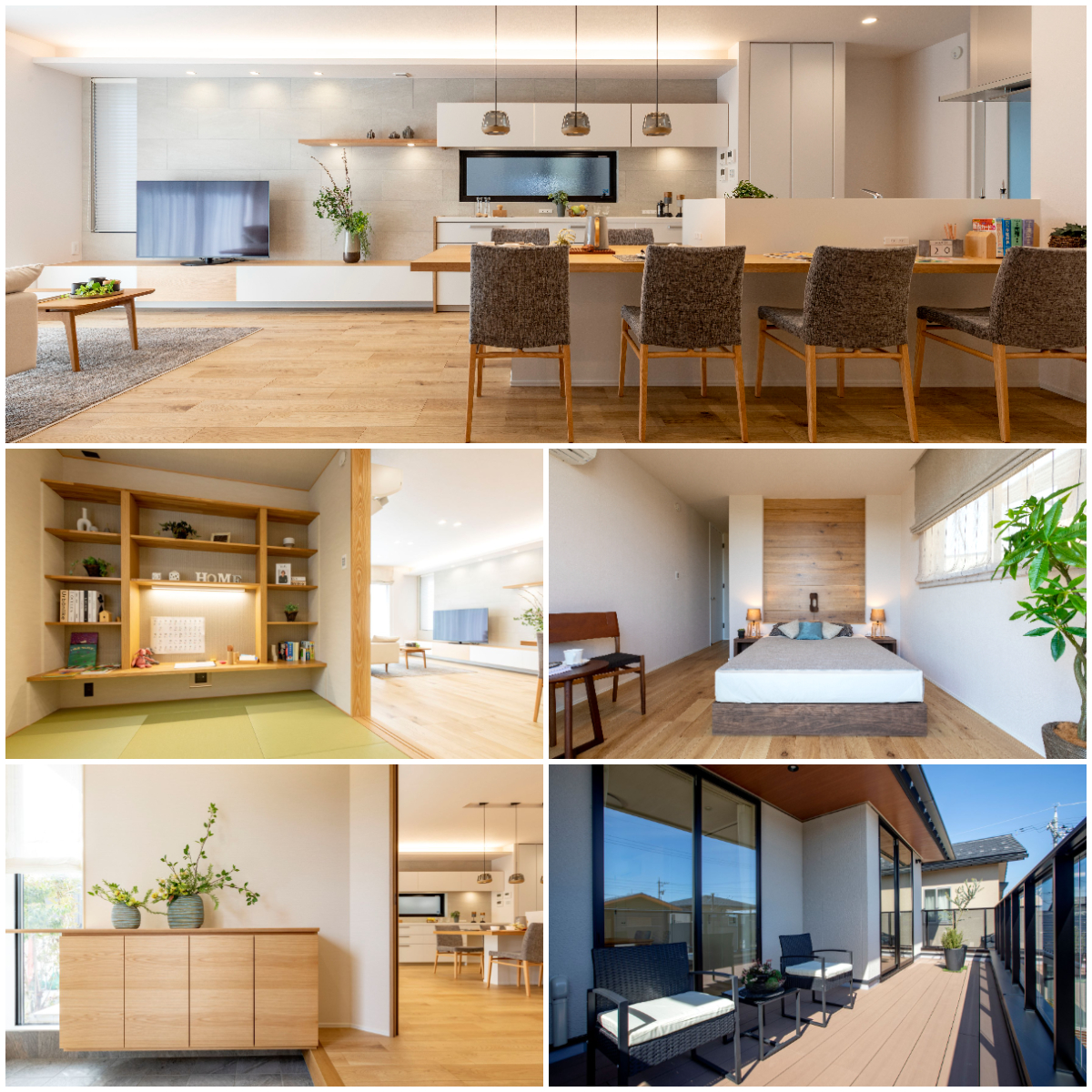 野々市カレッジタウン富陽モデルハウスには、家族みんなが住みよい工夫がいっぱい。料理をしながら家族を見守れるキッチン、洗濯物を干してすっきり片付けられる家族のクローゼット(カゾクロ)と洗濯動線、遊んだり昼寝をしたりとキッズスペースとしても使える自由度の高い和室、玄関先の手洗いカウンターや、屋外のプライベート空間として使えるウッドデッキバルコニーなど、取り入れたいアイデアが満載なのだ。