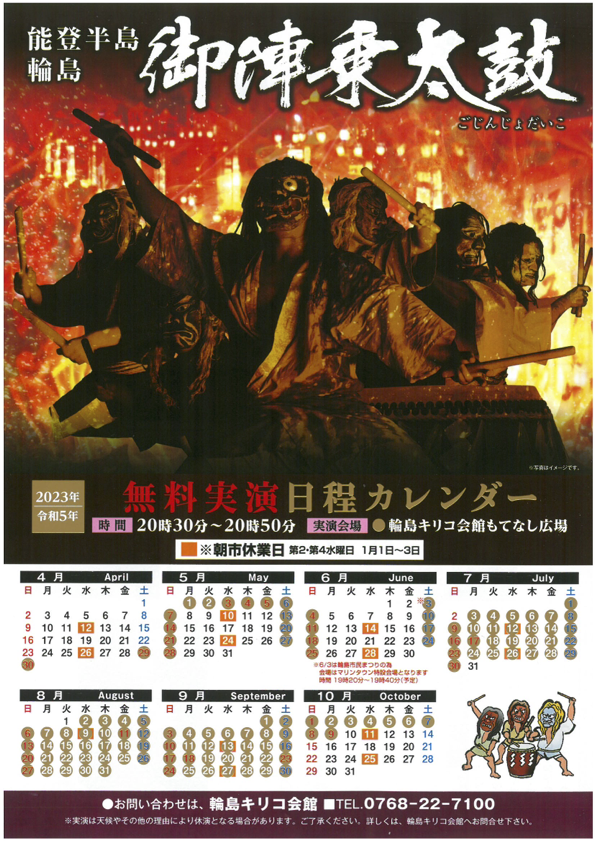 御陣乗太鼓の継承者たちが保存会を結成し、ホテルや観光施設で公演を行っているが、4月下旬から10月上旬にかけて『輪島キリコ会館』で御陣乗太鼓の無料実演を開催している。