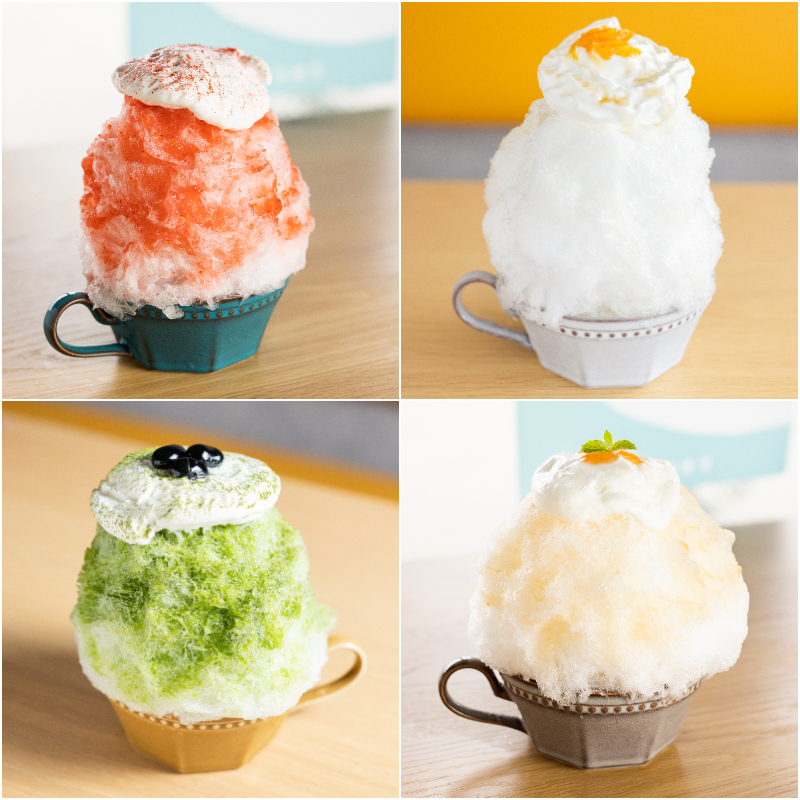 「いちごかき氷」は、福野の「遊花園」から仕⼊れたいちごを使って⼿作りしたオリジナルのフレッシュソースたっぷり。⽢酸っぱいいちごは⼈気商品。ヨーグルトエスプーマ使⽤、ミルクソースと苺がマッチした王道の美味しさ。「ジンジャーかき氷」は、⾃社農場「結いふぁーむ」でとれた⽣姜をつかった濃縮ドリンク「⽣姜のめぐみ」⼊りシロップと和歌⼭産不知⽕(しらぬい)で作ったママレードがいいアクセント。ヨーグルトエスプーマと中のパイナップルが爽やかにマッチする。「抹茶かき氷」は、店頭でも販売中の⿊⾖「福福福(みふく)」が、抹茶シロップとベストマッチ。⾷べ進めると小豆、きなこ、ミルクソースと味わいが変わっていくのが楽しい。こちらはミルクエスプーマを使⽤。「ももかき氷」は、福島県の川中島⽩桃を使⽤したシロップをかけ、かき氷の中には福島県産桃「あかつき」の糖漬けをたっぷりと。ヨーグルトエスプーマと桃のジャムがてっぺんにのった桃づくしのかき氷だ。どれも、オリジナルソースとふんわり氷との相性がよく、全種類制覇したくなる。今しか食べられない夏の一品を楽しもう。