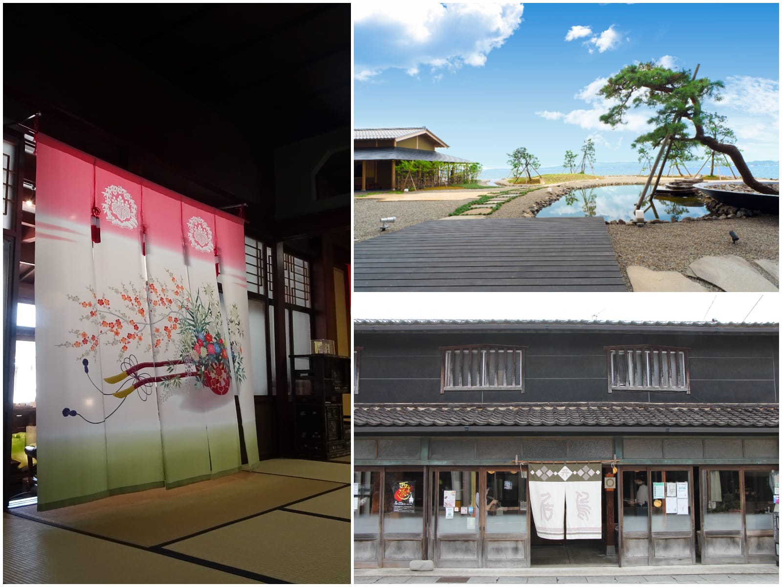 左/一本杉通り・各店での「花嫁のれん ものがたり展」、右上/加賀屋別邸 松乃碧、右下/老舗が並ぶ一本杉通りを散策。