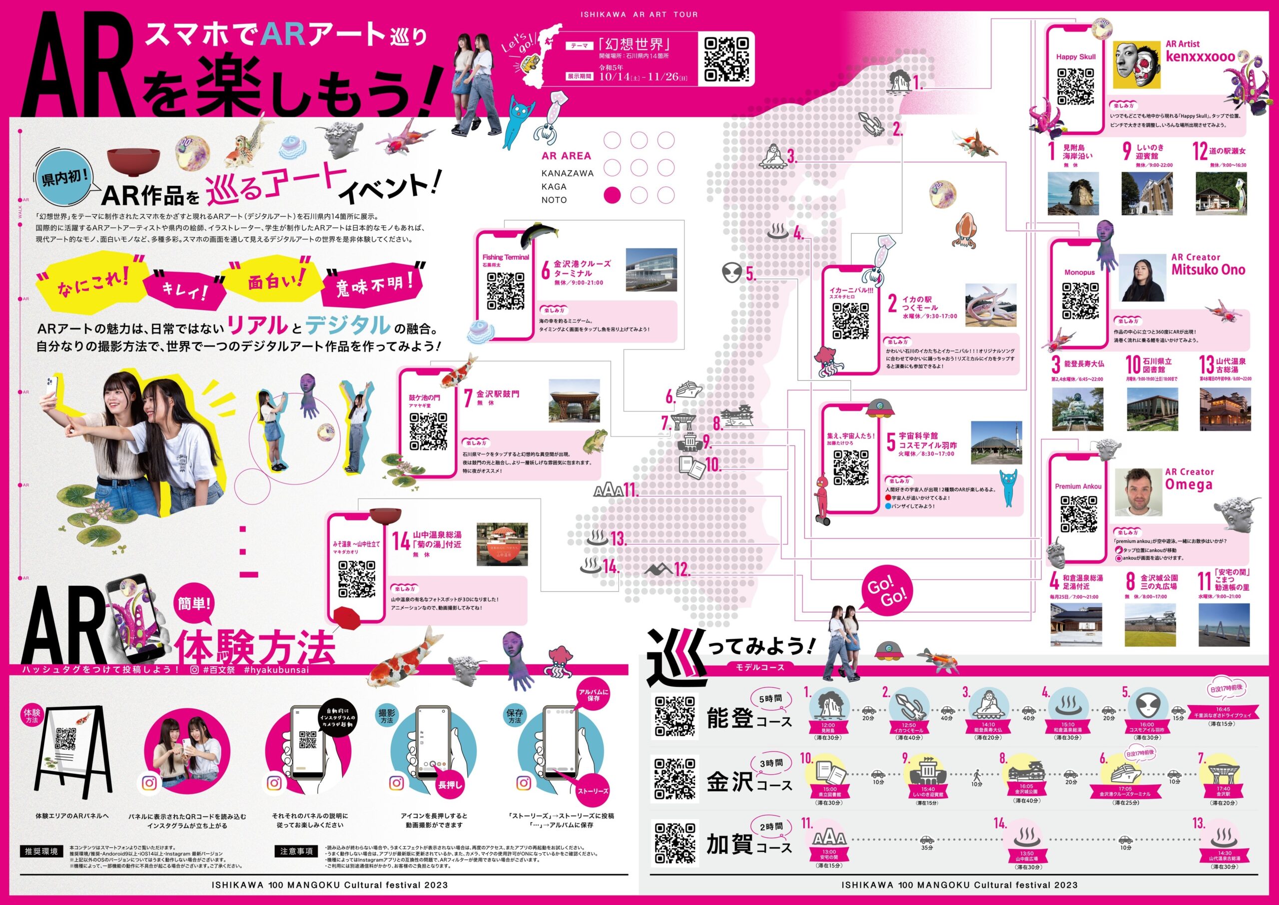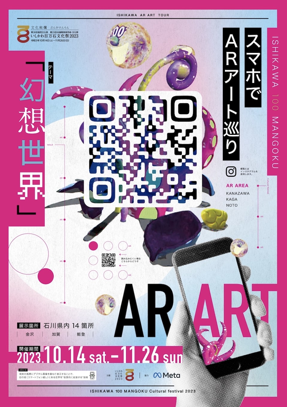 石川県内の金沢駅鼓門や見附島、和倉温泉などの名所や観光地に展示し、スマホを片手に周遊・鑑賞する企画。県内在住の浮世絵師・アマヤギ堂をはじめ、国際的に活躍する日本人ARアーティスト・kenxxxoooやドイツ出身のOmega、不気味でありながら独特のかわいさのあるARを制作するMitsuko Onoのほか、県内学生たちがARアート制作に携わった。