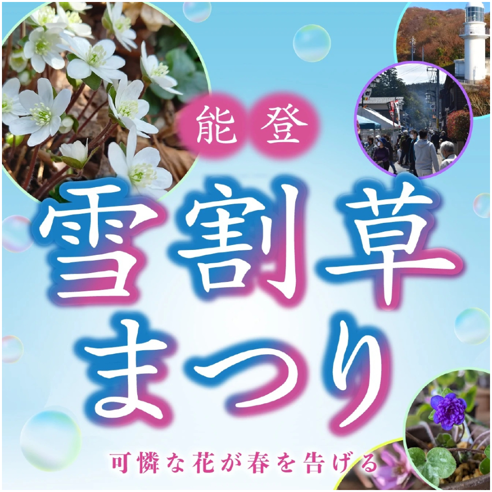 イベントでは雪割草の販売、門前そばや輪島ふぐ料理といった地元飲食店のブース出店、ステージイベント、子供縁日ブースなど、家族連れはもちろん友人同士でも楽しめる催しが満載。輪島市の市花となっている雪割草の花言葉は「忍耐」。厳しい寒さの中であっても花を咲かせる雪割草のように、一歩ずつ前に進んでいく足がかりとなる同イベントに足を運んでみてはどうだろうか。
