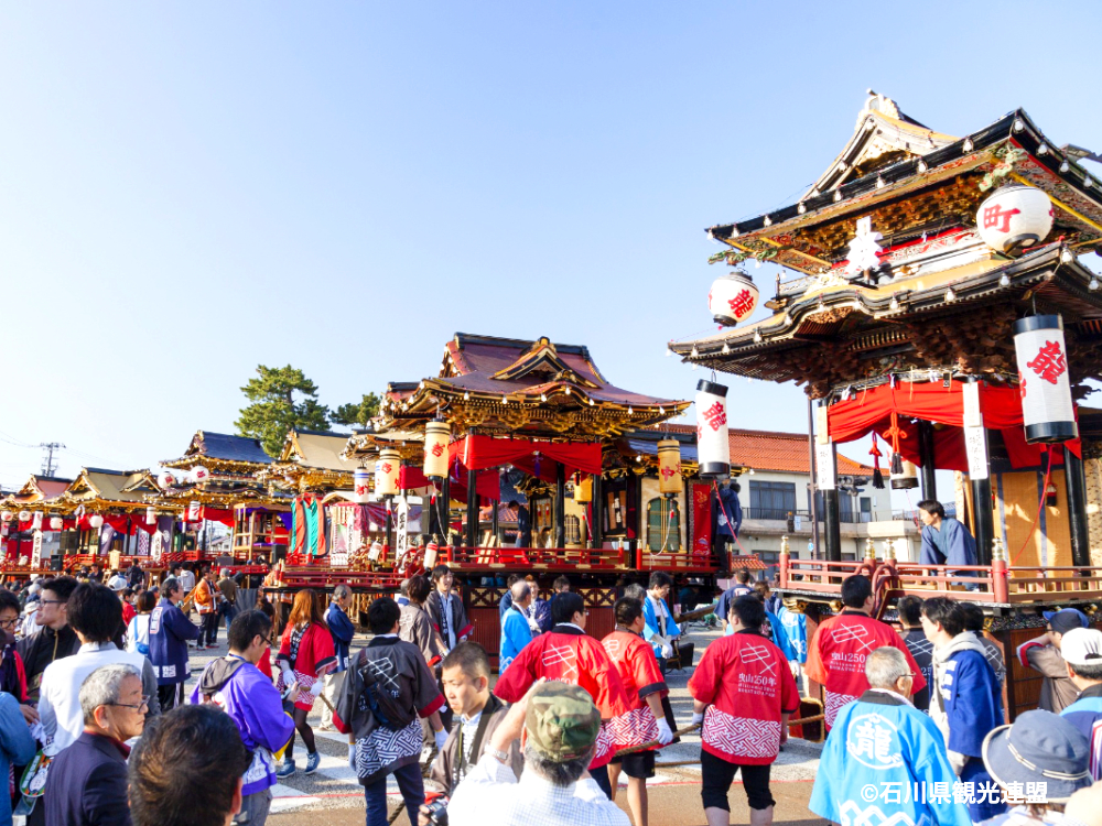 漆や金箔などで装飾された絢爛豪華な高楼式の曳山は小松市指定文化財、お旅まつりの曳山行事は石川県の無形民俗文化財に指定されている。クライマックスはなんといっても、それぞれの個性的なデザインが施された曳山が一堂に会する「曳山曳揃え」。ライトラップされた曳山が黄金色に輝く瞬間は、息を呑む美しさだ。