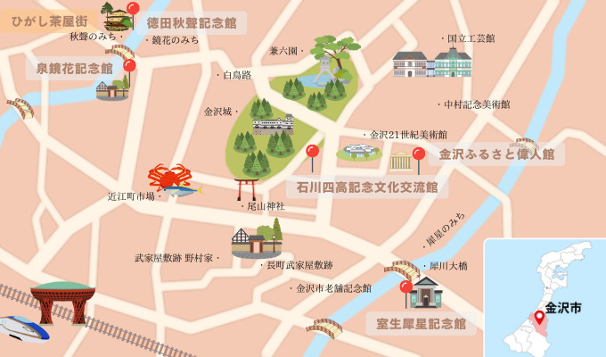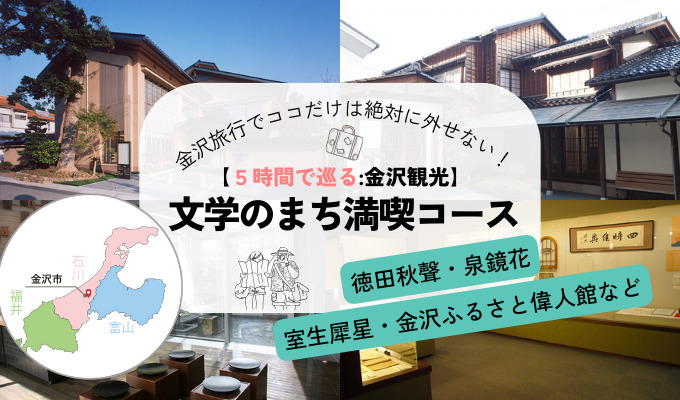 歴史と伝統の街金沢は「文学のまち」とも呼ばれます。昔から多くの作家や文学者に愛され、作品の舞台となってきました。そんな金沢生まれの三文豪「徳田秋聲(とくだしゅうせい)」「泉鏡花(いずみきょうか)」「室生犀星(むろおさいせい)」と、ふるさとの偉人たちを訪ねるちょっとディープな半日観光モデルコースをご紹介します。