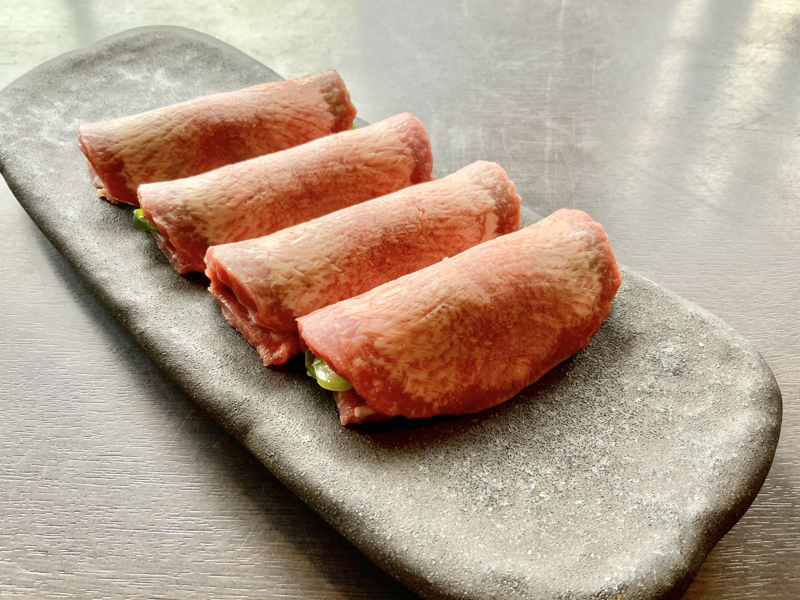 東金沢駅の裏手にある郊外の焼肉店『有牛』。店主自ら厳選した黒毛和牛を中心に、自社のセントラルキッチンから常に鮮度の良い肉を提供する同店は、美味しい肉がリーズナブルな価格で食べられると足しげく通うファンが多い。新鮮で高品質のロースだからこそできる、10秒焼いてワサビで味わう「10秒ロース」や特製ユッケ風のたれで楽しむ「3秒もも」などの名物メニューの他、鮮度抜群のタンや希少部位、ホルモンなど、肉好きを満足させるメニューが揃う。また、焼肉業界という分野にとらわれず、洋食の知識や多彩な調味料を活かした珍しい料理も好評。バーニャカウダやスペイン産生ハムと黒トリュフオイルを使ったサラダ、蜂蜜を使ったチーズ豆腐など、ワインに合うおつまみメニューも充実している。この他、肉の舟盛や肉ケーキ、お祝いの肉プレートといった、インスタ映えする肉の盛り付けも話題で、笑顔になれるエンターテイメント要素が盛りだくさんだ。居心地の良いアットホームな佇まいと肉の美味しさを色々な形で提供してくれる繁盛店、いつ誰と来ても満足できること間違いない。