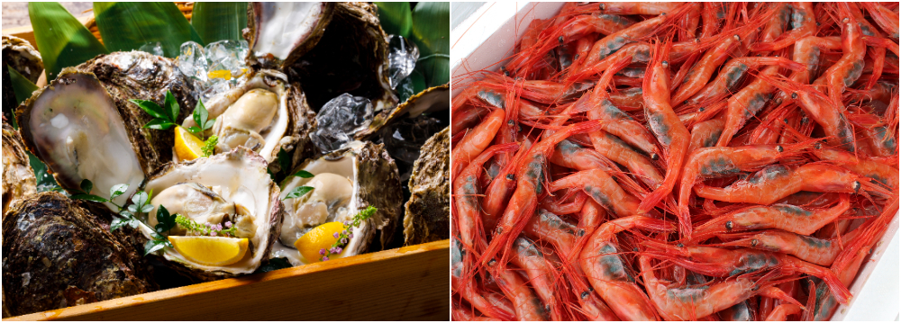 志賀町には、志賀町産の食材にほれ込んで店を構えた料理店が多数存在する。特に、魚介の魅力は「他にはない」と感じているシェフも多いようだ。まず種類が豊富。日本海側に生息する魚介類約800種の内、約500種が能登沖で獲れるというから驚きだ。暖流と寒流がぶつかる独特の漁場のため、アジ、サバ、サワラ、カマスなど暖流系の魚とタラ、ハタハタ、ゲンゲなど寒流系の魚が同時に獲れるのも面白い。また、水深200メートル以下の層はミネラルを豊富に含む「日本海固有水」と呼ばれ、そのエリアには甘えび、シマエビ、ズワイガニ、毛ガニが生息する。甘みの乗った各種カニは言うまでもないが、甘えびがまた絶品。「海のルビー」、「赤い宝石」とも称され、艶めく赤さとねっとりとした甘さが自慢。腹に抱えた卵は新鮮な証拠。卵は塩漬けにすれば即席珍味の出来上がりだ。また、2020年夏には半世紀ぶりに高浜漁港沖合5キロで獲れるヨコタ礁の岩牡蠣が復活した。濃厚な旨みを感じる超特大牡蠣は、まさに能登の海からもたらされた贈り物。一年を通して漁を行っているため、四季折々に美味を楽しみたい。