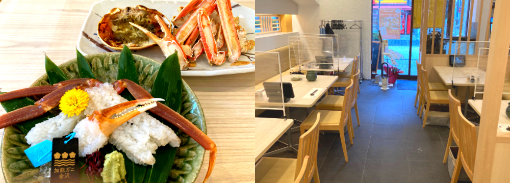 石川県のカニ漁が解禁となる11月から3月までは、石川県産の高級ブランド食材「加能ガニ」の刺身と焼きが昼から味わえる。4月から10月は当日朝どれの新鮮なアジの美味しさを堪能できる人気メニューが登場する。GW間近は、金沢名物のどぐろの切り身をはじめ、本店でも人気の高い「いくら丼」や「カニクリームコロッケ」などがセットになった豪華なランチが用意されている。名物の「カニクリームコロッケ」は、同店が洋食屋としてスタートした46年前からあるファンの多いメニュー。金沢の名物グルメを一度に楽しめるのが魅力だ。